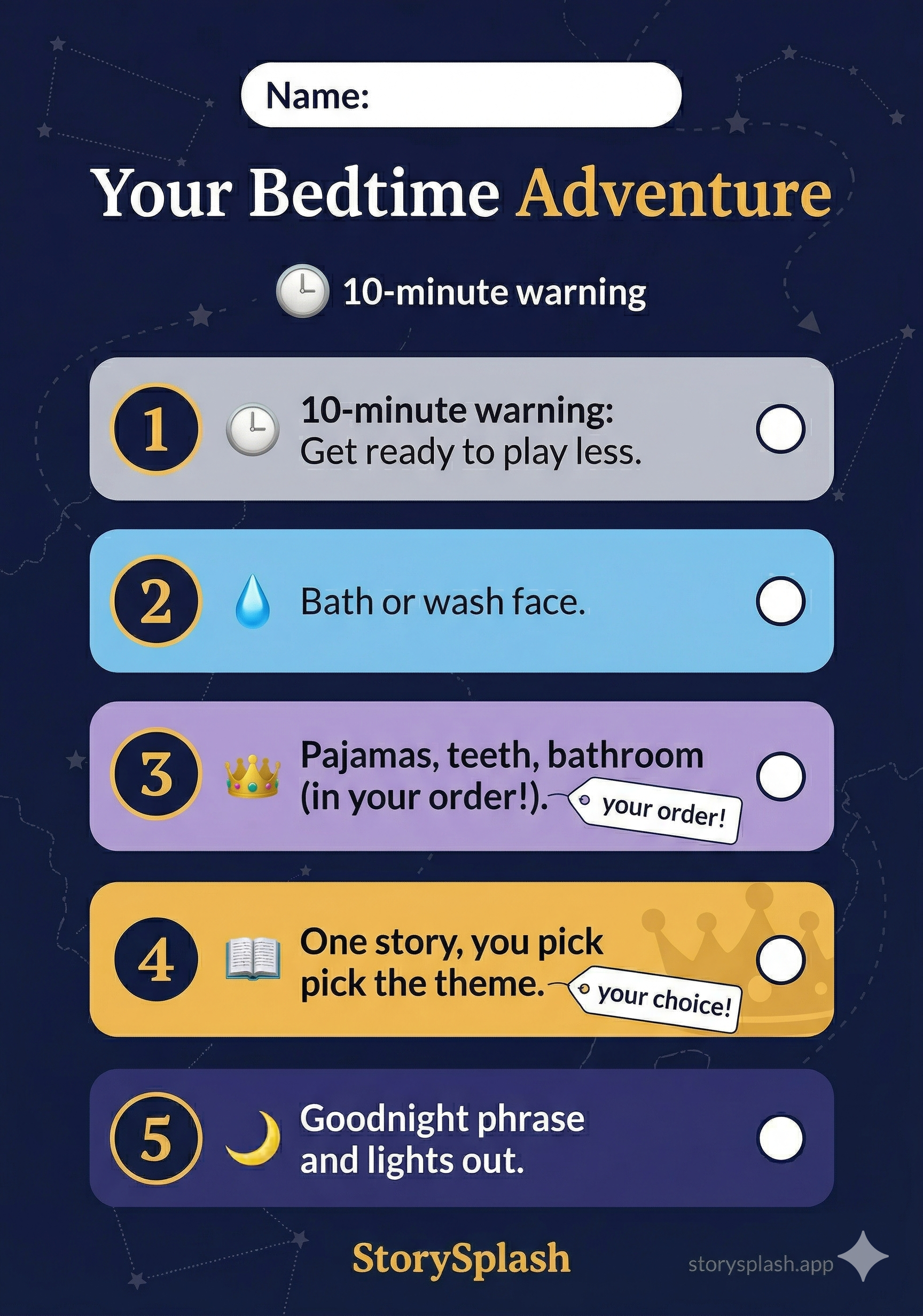Practical tip: Put the routine chart somewhere your child can see it from their bed. Pointing to the chart replaces the need to repeat instructions out loud every night.