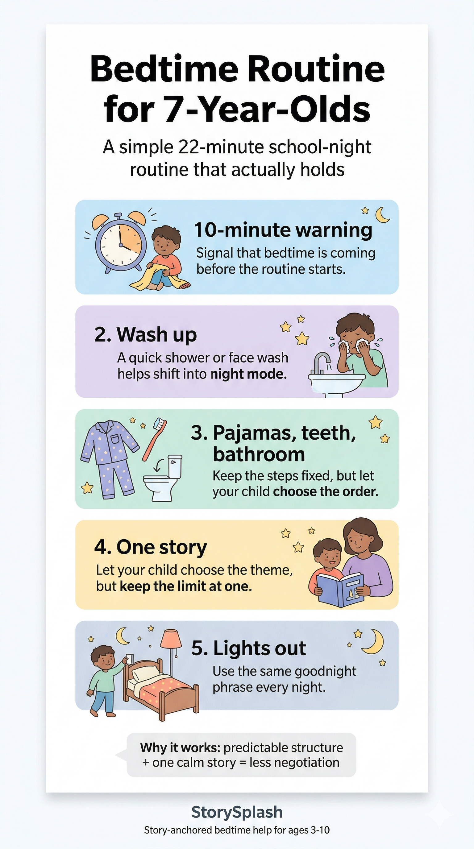 Seven-year-olds are rarely chaotic about bedtime in the way toddlers are. They are strategic. They know how time works. They remember past exceptions. They can build a surprisingly good case for why tonight should be different. The routine that works at this age is not harsher. It is clearer.