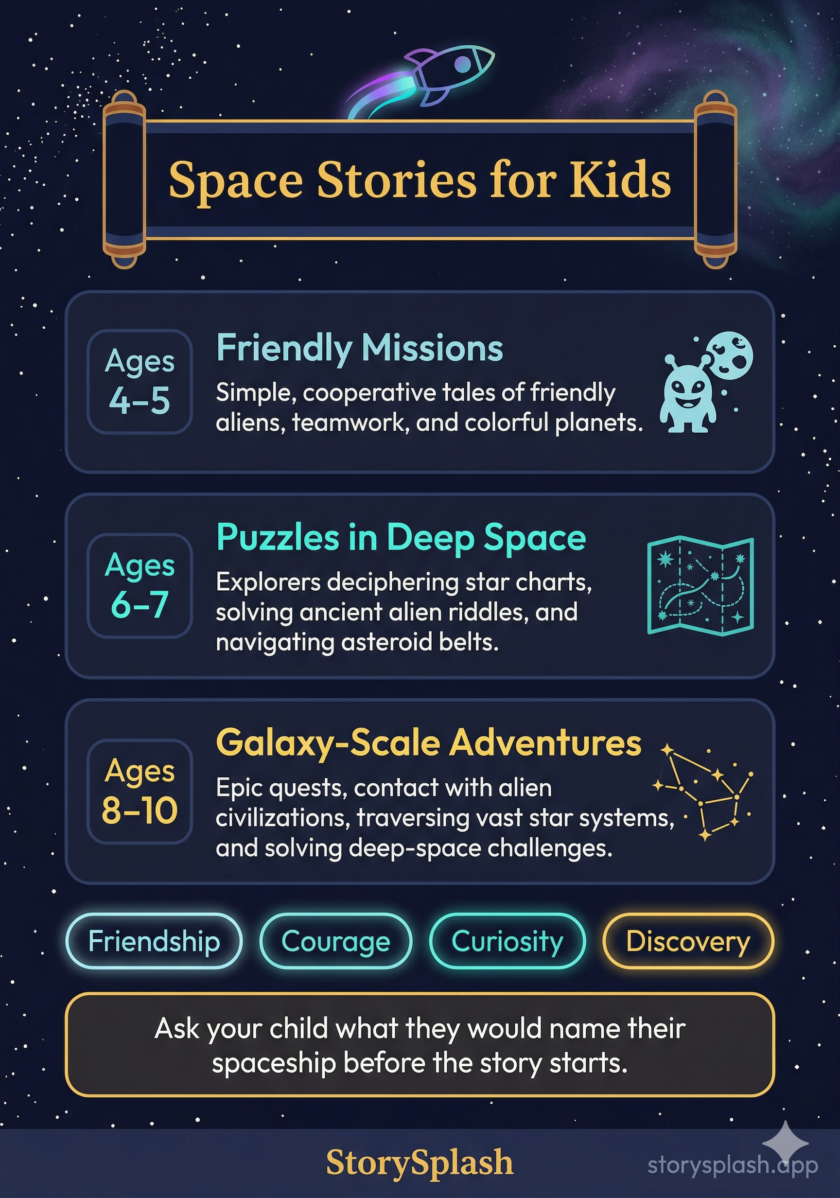 Ages 4–5: Keep the universe small and friendly. A single planet, a helpful alien, and a short mission work best. Children this age want to feel brave and capable, not overwhelmed by scale. A story where your child pilots a little rocket to bring something back for a lonely star-creature is exactly the right scope.